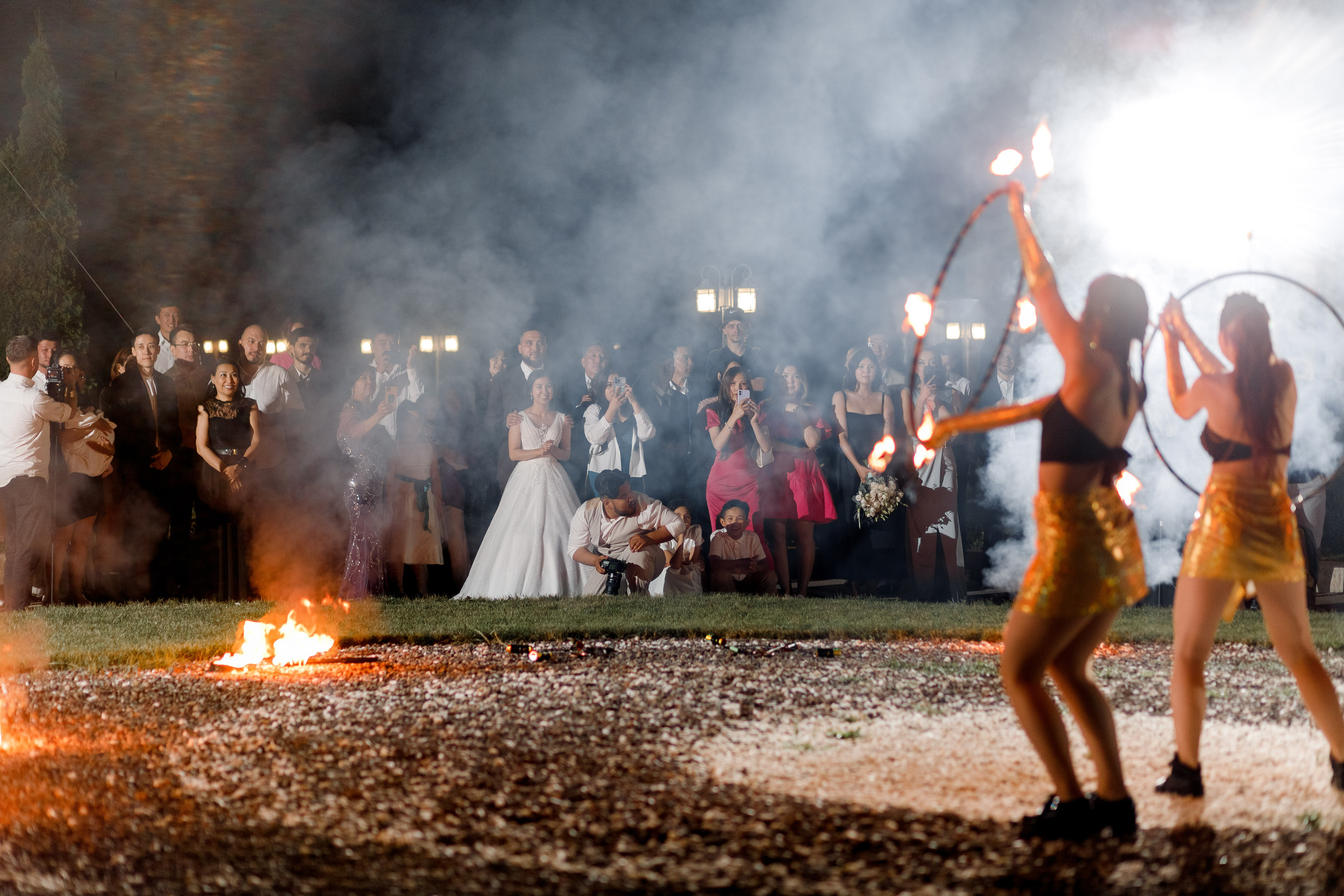 В наших выступлениях мы используем разнообразные виды огненного и пиротехнического реквизита: от классических поев и жгучих снейков до грациозных вееров и обручей.
